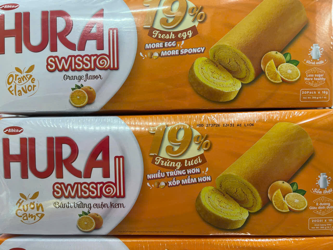 Bánh trứng cuộn kem Hura vị cam – Hộp 360g (20 gói)